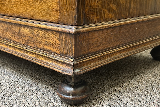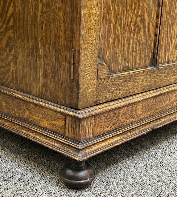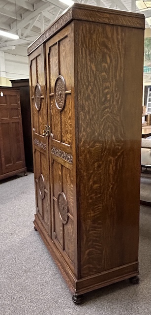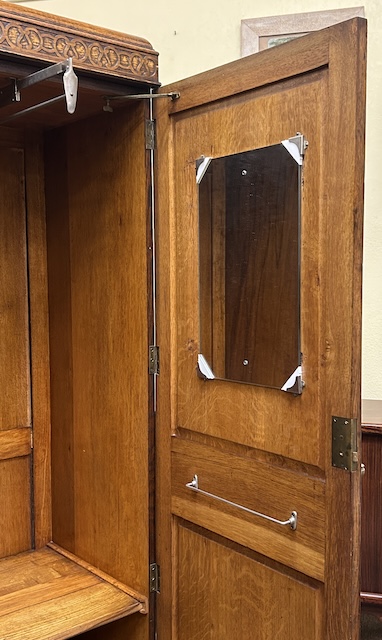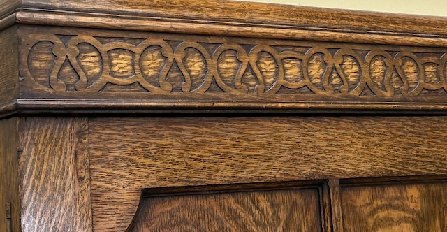 Item #AH50 Antique English Oak Armoire w/ Pokerwork Carving Detail c.1910