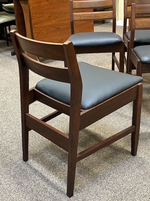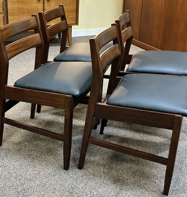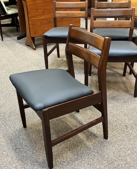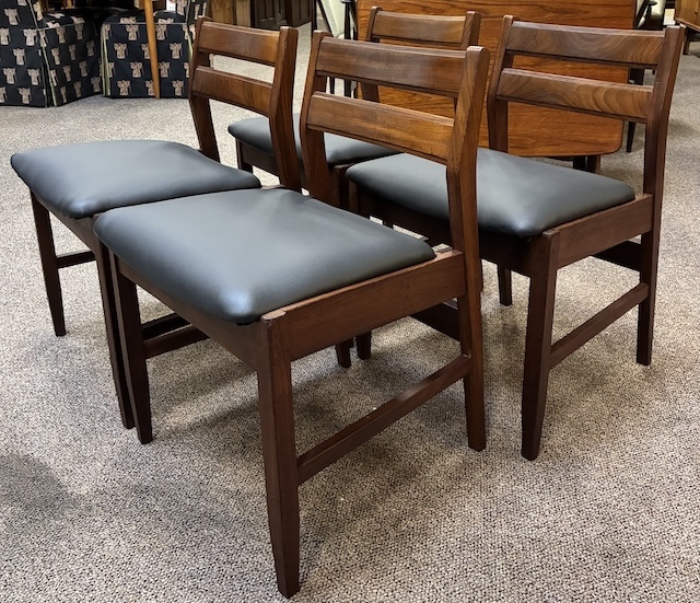 Item #AH73 Set of Four Mid Century Modern Teak Frame Dining Chairs w/ Black Vinyl Seats c.1960