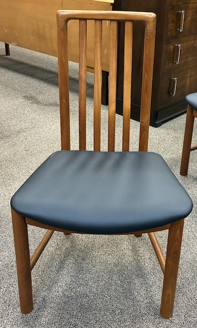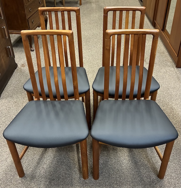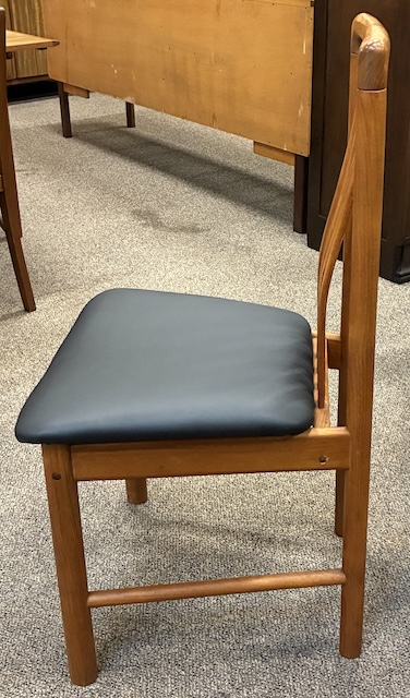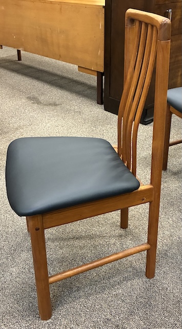 Item #PB76 Set of Four Vintage Teak Framed Dining Chairs w/ Black Vinyl Seats