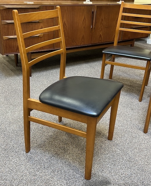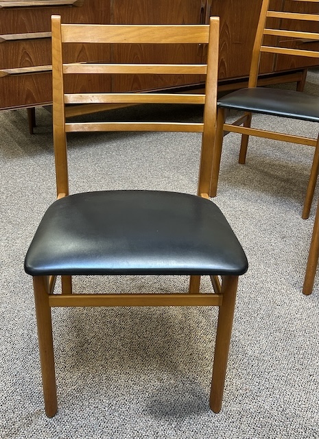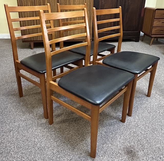 Item #PC36 Set of Four Mid Century Modern Teak Frame & Black Vinyl Seat Dining Chairs c.1960