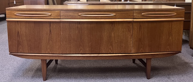Item #PC91 Mid Century Modern Bow Front Teak Credenza w/ Drop Front Mini-Bar