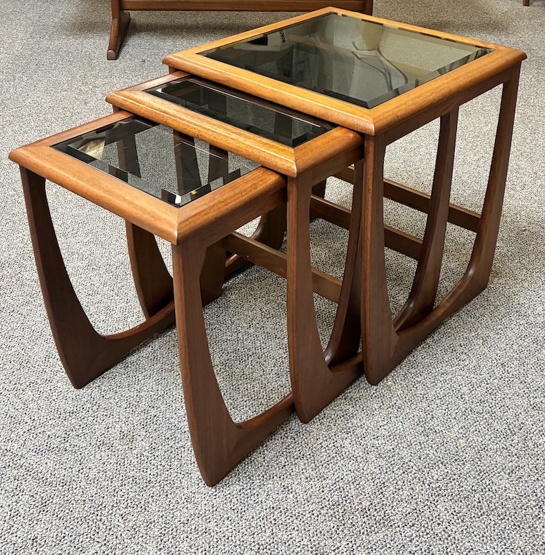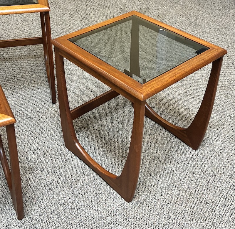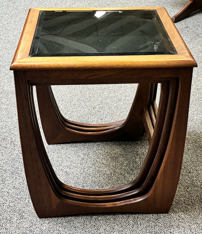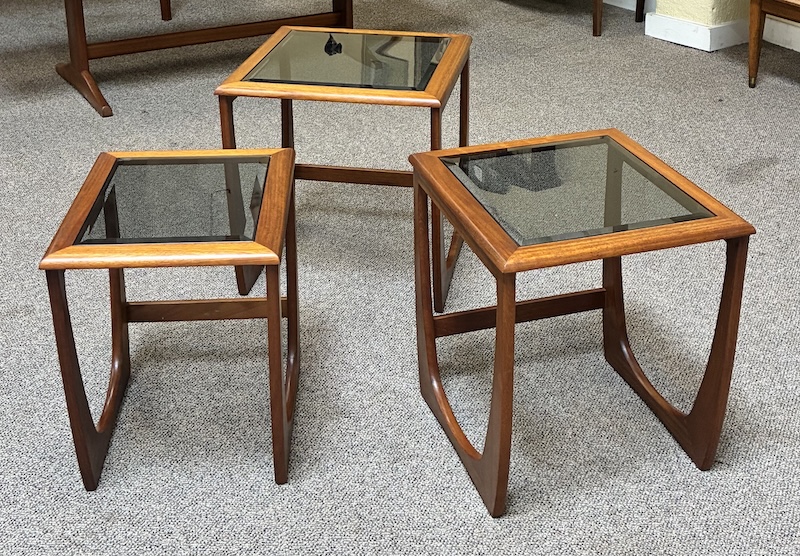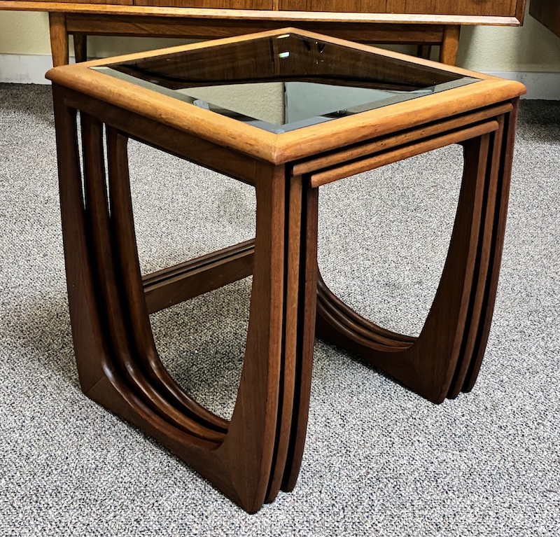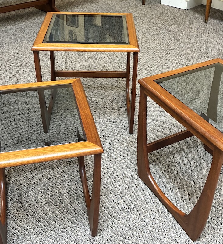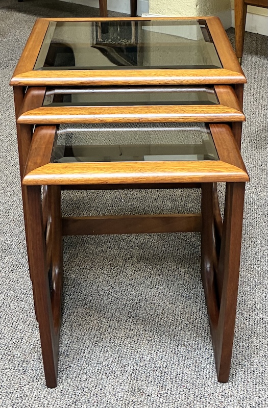 Item #PD10 Mid Century Modern Teak Frame Nesting Tables w/ Smokey Glass Tops by G-Plan, UK c.1960