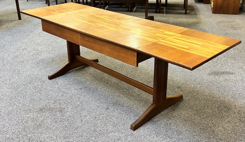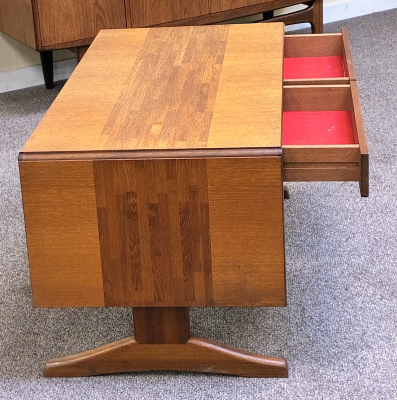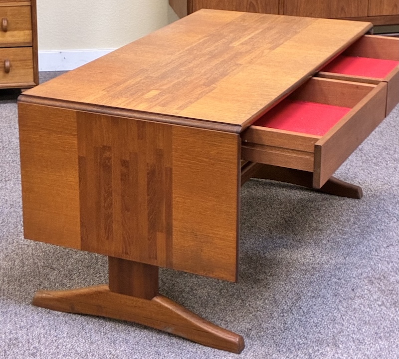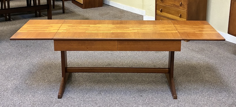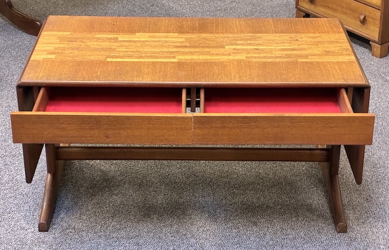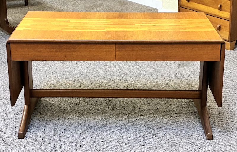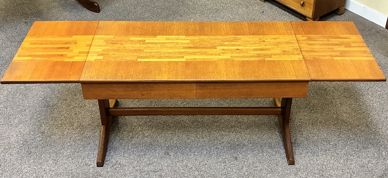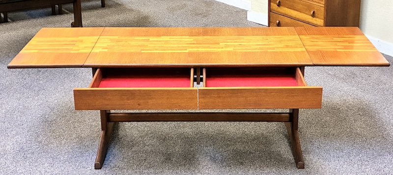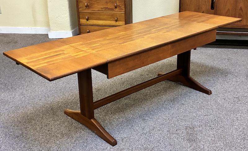 Item #PD47 Mid Century Modern Extending Drop Leaf Trestle Base Coffee Table w/ Two Drawers by McIntosh c.1960