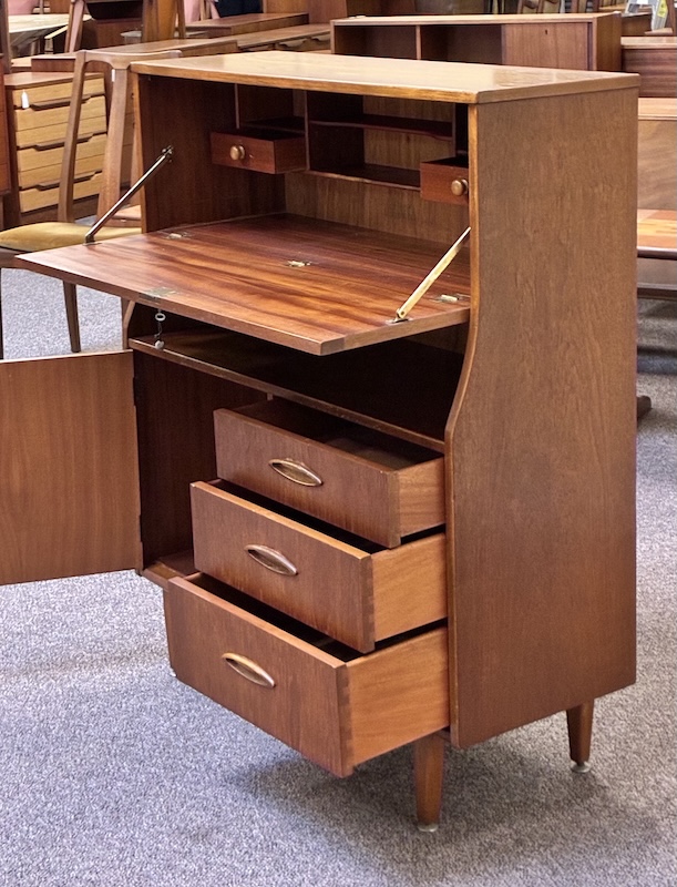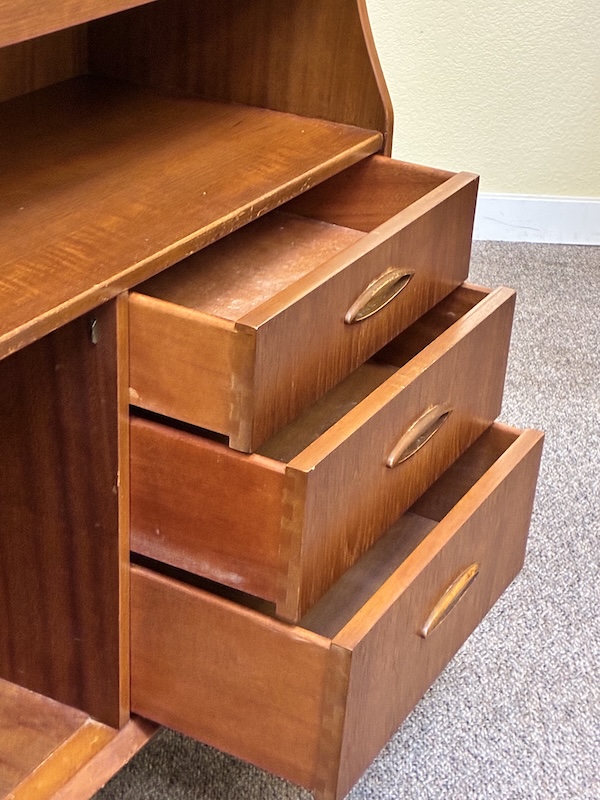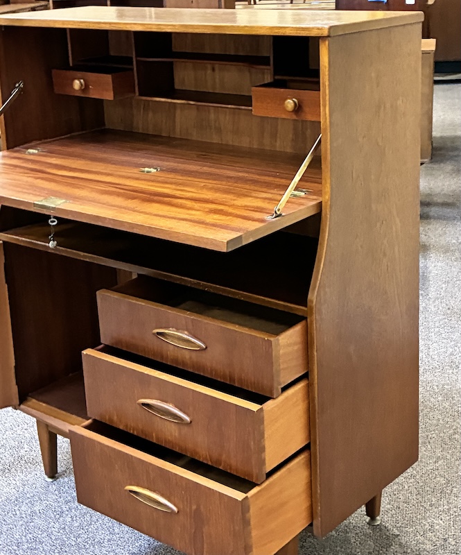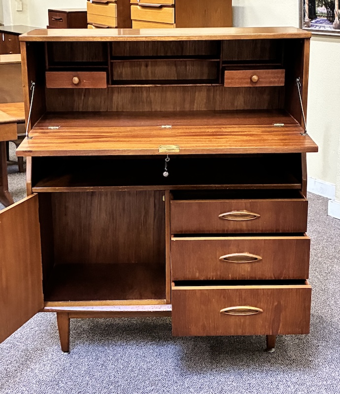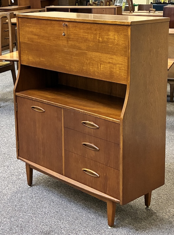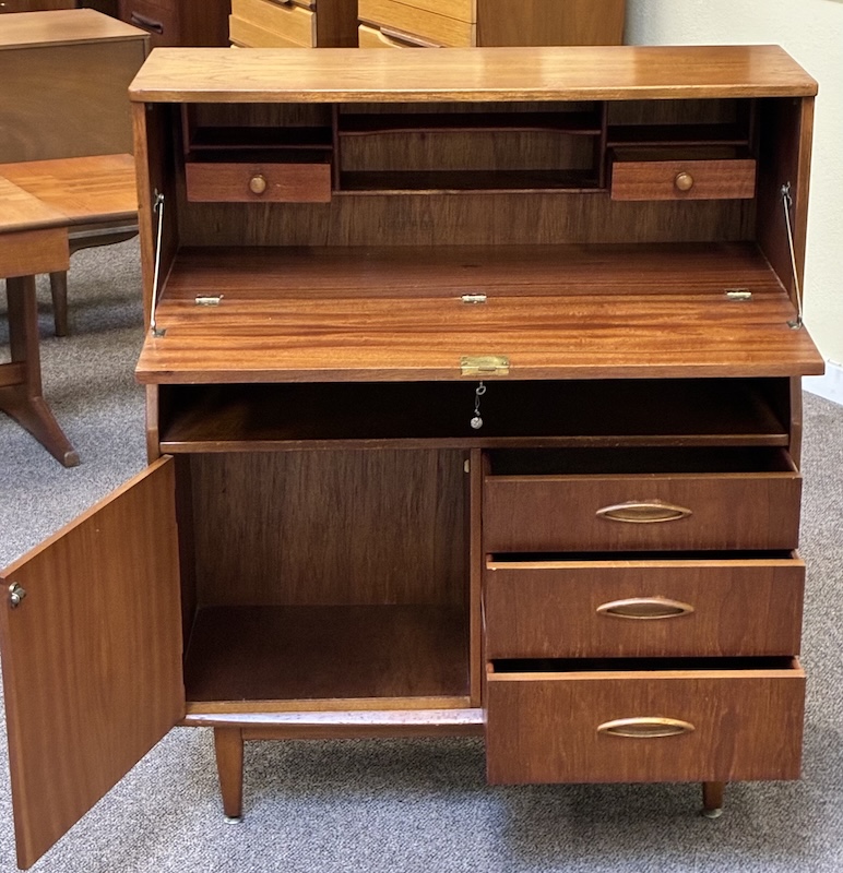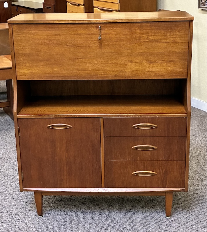 Item #PD62 Mid Century Modern Teak Drop Front Bureau / Desk w/ Cabinet Space & Drawers c.1960