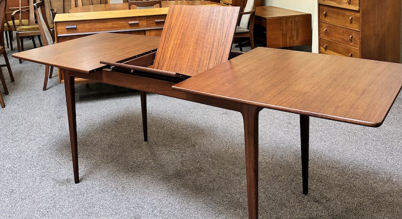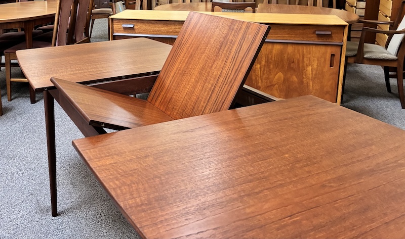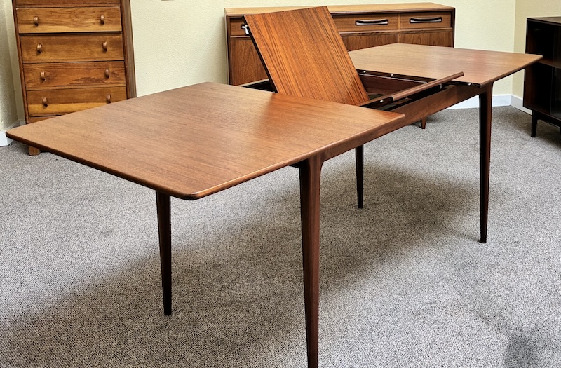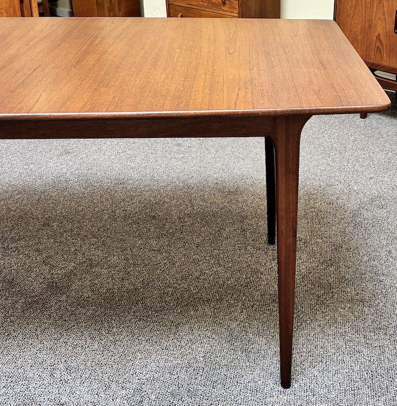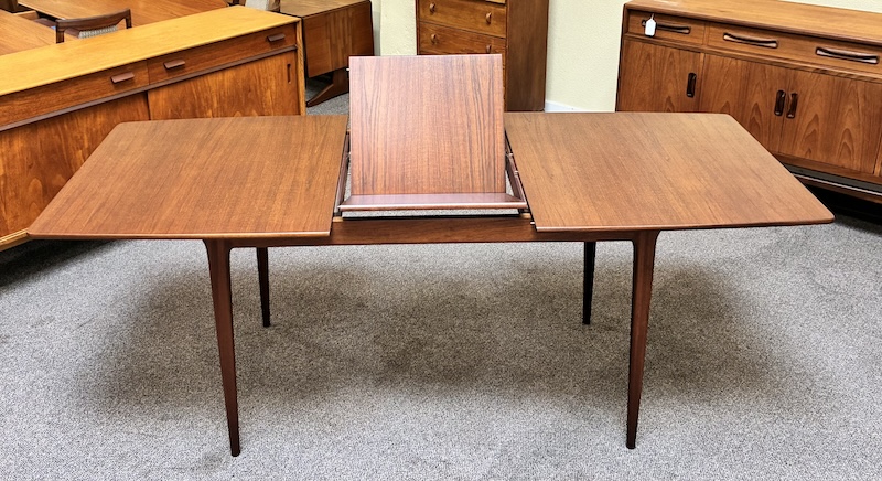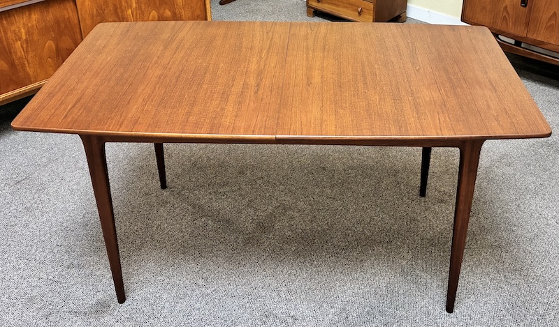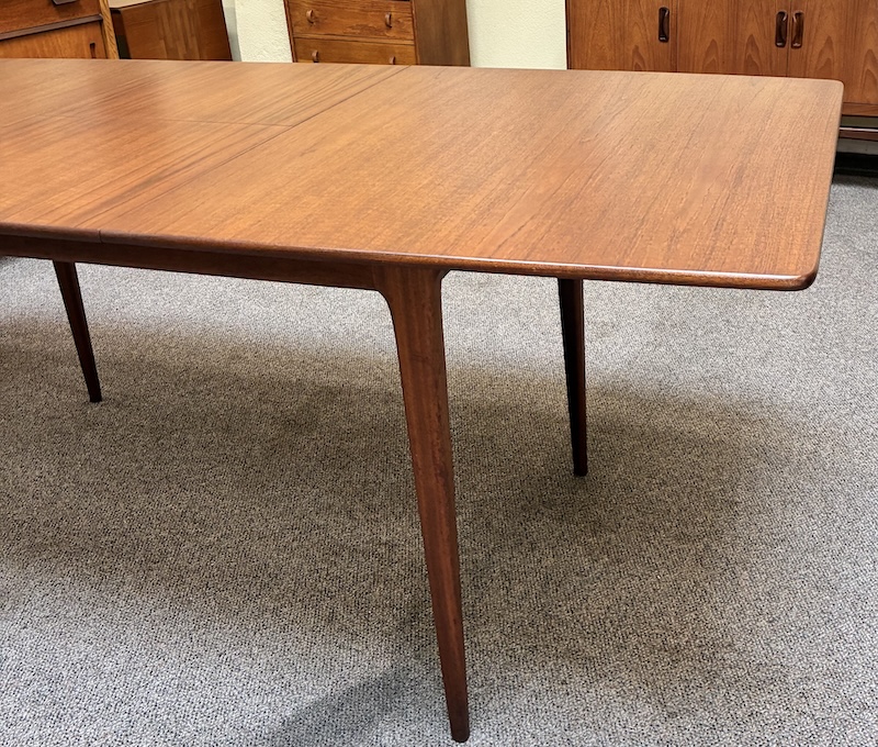 Item #PD82 Mid Century Modern Extending Teak Dining Table w/ Butterfly Leaf & Tapered Ends by McIntosh c.1960